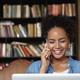 Beautiful student girl with charming smile talking on mobile phone while studying at college library, using wireless internet connection on laptop computer, shelves with books in background