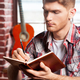 Creative composer. Handsome young man writing something in note pad while acoustic guitar laying in the background