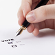 Woman hand voting yes in check-box with blue fountain pen in the air