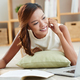 Portrait of young smiling woman studying at home