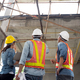 The engineering team working at building site meeting and discussing on laptop . Team onsite of architecture inspector and discuss together