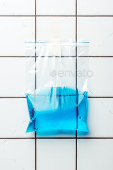 ziplock plastic bag with blue water hanging on tile wall, earth day concept