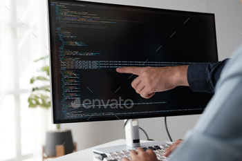 Back of Male Computer Programmer Working at Desk Looking at Screens with Code in Office
