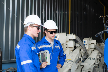 Industrial workers working with robotic arm welding machine in factory, Robotic arm welding industry