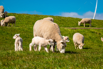 Lambs and Sheep on the dutch dike by the lake IJsselmeer,Spring views , Netherlands Sheeps in a