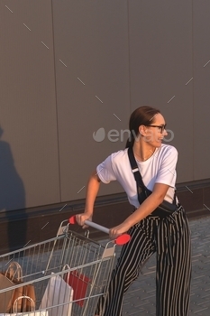 Beautiful young girl with paper bags with purchases near the shopping mall in the sunlight with supe