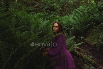 The young woman in purple dress in rainforest with fern. Concept of nature and happy life, adventure